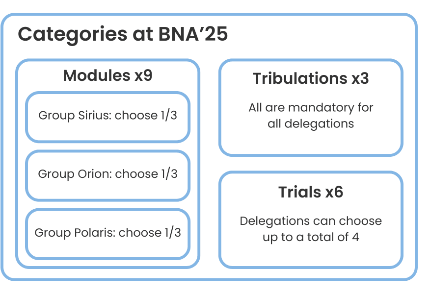 The 9 modules are the core of BNA, spread across three groups: Sirius, Orion, and Polaris. Delegates must participate in three modules, one from each group, over the event’s three days. Each module has three rounds, contributing to the leaderboard, and elimination is possible between rounds.
